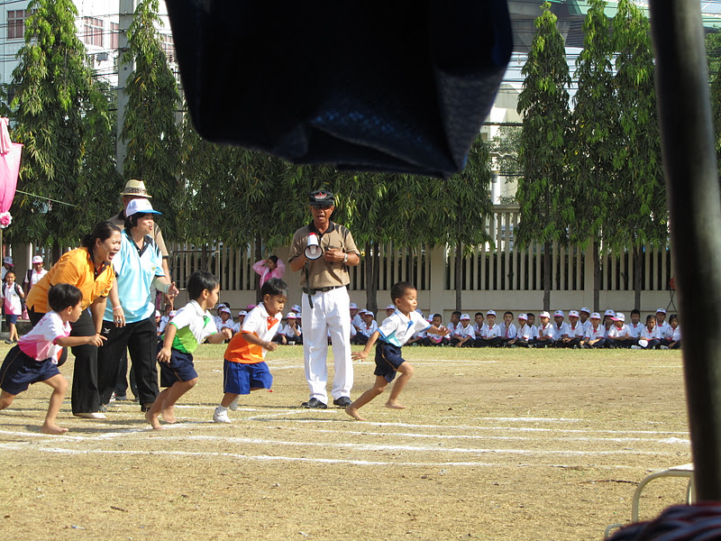 After arriving home from Koh Samet I prepared for the next week of classes. This week was Sports Day, which the kids prepare all year for. It is a mini Olympics where all the kids compete in different games, such as track, football, tug of war, and a lot of Thai games I don't know the name of. They receive awards at the end of the games on Friday. The few days leading up to the games, which start on Thursday, were pretty lacking in terms of academic rigor or the amount of English language that was disseminated and learned by the students. In other words they were really excited for Sports Day, and we got very little done. On Weds. the students were in assembly all day preparing for the games. On Thursday morning when I arrived at the school the kids were getting ready to go on a parade. To open the games the whole school marches down Suksawat, which is a very busy street, to a monastery and then everyone prepares to march back into the school to open the games. The students were separated into four different teams based on color: blue, green, orange, and pink. Each group marched with the rest of their team and lined up with their group in the monastery. Right before we began the march back, the high school marching band came to lead everyone on the walk back. Once we arrived back the different teams marched around the field to the applause of their parents, and after all of the teams had arrived two students came running into the stadium with a fake torch and lit a fake fire to mimic the real Olympic games.